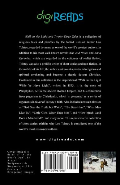 "Walk in the Light and Twenty-Three Tales" is a collection of religious tales and parables by the famed Russian author Leo Tolstoy, regarded by many as one of the world’s greatest authors. In addition to his most well-known novels "War and Peace" and "Anna Karenina," which are regarded as the epitomes of realist fiction, Tolstoy was also a prolific writer of short stories and non-fiction. In the middle of his life, the author underwent a profound religious and spiritual awakening and become a deeply devout Christian. Contained in this collection is the inspirational "Walk in the Light While Ye Have Light", written in 1893. It is the story of Pamphylius, set in the ancient Roman Empire, and his conversion from paganism to Christianity, which is presented as a series of arguments in favor of Tolstoy’s faith. Also included are such classics as "God Sees the Truth, but Waits", "The Bear-Hunt", "What Men Live By", "Little Girls Wiser Than Men", and "How Much Land Does a Man Need?", and many more. This representative collection of short stories exhibits why Leo Tolstoy is considered one of the world’s most renowned authors. This edition is printed on premium acid-free paper.