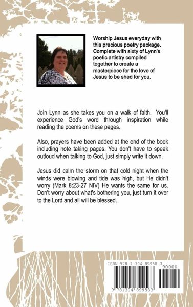 A collection of Christian Poetry all piled together to bring every reader one step closer to God. This book is filled with sixty poems along with Bible verses and prayer pages for your own use. Join Lynn as she pours out the word of God to your soul.