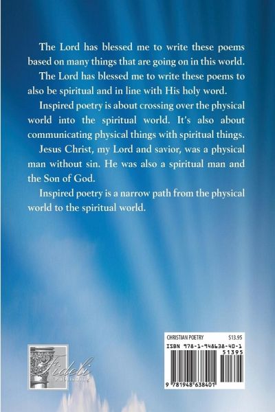 The Lord has blessed me to write these poems based on many things that are going on in this world. The Lord has blessed me to write these poems to also be spiritual and in line with His holy word. Inspired poetry is about crossing over the physical world into the spiritual world. It's also about communicating physical things with spiritual things. Jesus Christ, my Lord and savior, was a physical man without sin. He was also a spiritual man and the Son of God. Inspired poetry is a narrow path from the physical world to the spiritual world.