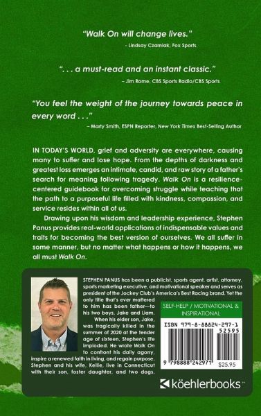 Stephen Panus has been a publicist, sports agent, artist, attorney, sports marketing executive, and motivational speaker and serves as president of the Jockey Club's America's Best Racing brand. Yet the only title that's ever mattered to him has been father-to his two boys, Jake and Liam.When his elder son, Jake, was tragically killed in the summer of 2020 at the tender age of sixteen, Stephen's life imploded. He wrote Walk On to confront his daily agony, inspire a renewed faith in living, and regain purpose. Stephen and his wife, Kellie, live in Connecticut with their son, foster daughter, and two dogs.