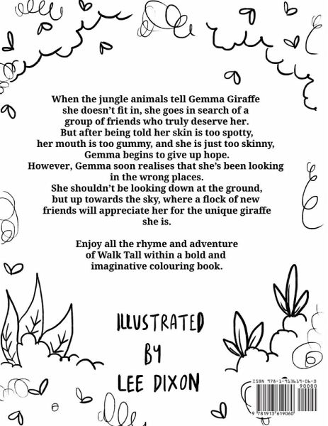 When the jungle animals tell Gemma Giraffe she doesn't fit in, she goes in search of a group of friends who truly deserve her. But after being told her skin is too spotty, her mouth is too gummy, and she is just too skinny, Gemma begins to give up hope.However, Gemma soon realises that she's been looking in the wrong places. She shouldn't be looking down at the ground, but up towards the sky, where a flock of new friends will appreciate her for the unique giraffe she is. Enjoy all the rhyme and adventure of Walk Tall within a bold and imaginative colouring book.
