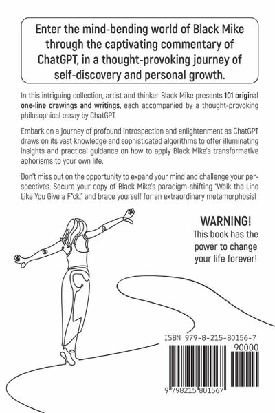 ORIGINAL ART & MICRO POETRY COLLECTOR'S LIMITED EDITION Enter the mind-bending world of amazon bestselling and award-winning author Black Mike through the captivating commentary of ChatGPT, in a thought-provoking journey of self-discovery and personal growth. With his brutally honest original 101 one-line drawings and writings, artist and thinker Black Mike shows how to stop identifying with extremes, but rather walk the line between them, to reach the fragile balance that provides a more meaningful and rewarding life. Embark on a journey of profound introspection and enlightenment as ChatGPT draws on its vast knowledge and sophisticated algorithms to offer illuminating insights and practical guidance on how to apply Black Mike's transformative quotes to your own life. Don't miss out on the opportunity to expand your mind and challenge your perspectives. Secure your copy of Black Mike's paradigm-shifting "Walk the Line Like You Give a F*ck," and brace yourself for an extraordinary metamorphosis! WARNING! This book has the power to change your life forever! What you should expect to find in this book:Self-Help - Practical advice and insights for personal development, self-improvement, and achieving a better understanding of oneself. Personal Transformation - Focus on individual growth, mindset shifts, and the pursuit of a more fulfilling life. Philosophy - Drawing on philosophical concepts to provide readers with a framework for understanding and navigating life's challenges. Relationships - Interpersonal relationships, communication, and emotional intelligence. Motivational - Inspiration and motivation for readers to take action and make positive changes in their lives. Happiness - Exploring the pursuit of happiness, contentment, and living a more authentic and meaningful life. Success - What is success and the principles and habits that contribute to personal and professional success. If you liked Mark Manson's "The Subtle Art of Not Giving a F*ck," and Ryan Holiday's "The Daily Stoic," you'll love Black Mike's captivating and inspiring book.