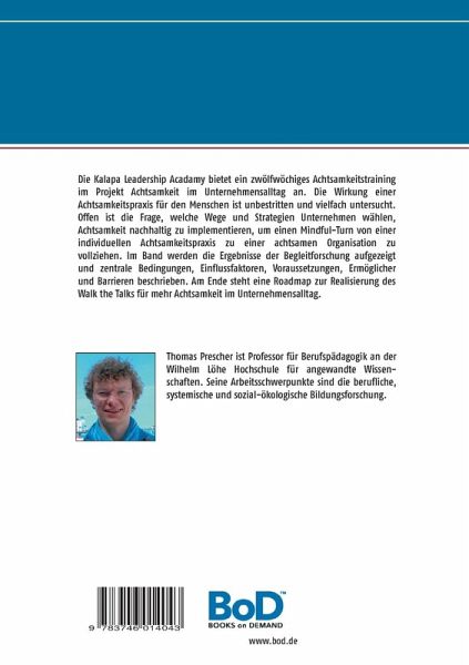 Die Kalapa Leadership Acadamy bietet ein zwölfwöchiges Achtsamkeitstraining im Projekt Achtsamkeit im Unternehmensalltag an. Die Wirkung einer Achtsamkeitspraxis für den Menschen ist unbestritten und vielfach untersucht. Offen ist die Frage, welche Wege und Strategien Unternehmen wählen, Achtsamkeit nachhaltig zu implementieren, um einen Mindful-Turn von einer individuellen Achtsamkeitspraxis zu einer achtsamen Organisation zu vollziehen. Im Band werden die Ergebnisse der Begleitforschung aufgezeigt und zentrale Bedingungen, Einflussfaktoren, Voraussetzungen, Ermöglicher und Barrieren beschrieben. Am Ende steht eine Roadmap zur Realisierung des Walk the Talks für mehr Achtsamkeit im Unternehmensalltag.