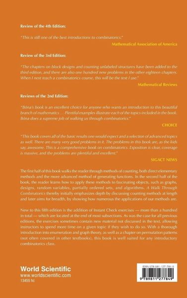 The first half of the book walks the reader through methods of counting, both direct elementary methods and the more advanced method of generating functions. Then, in the second half of the book, the reader learns how to apply these methods to fascinating objects, such as graphs, designs, random variables, partially ordered sets, and algorithms. In short, the first half emphasizes depth by discussing counting methods at length; the second half aims for breadth, by showing how numerous the applications of our methods are. New to this fifth edition of A Walk Through Combinatorics is the addition of Instant Check exercises - more than a hundred in total - which are located at the end of most subsections. As was the case for all previous editions, the exercises sometimes contain new material that was not discussed in the text, allowing instructors to spend more time on a given topic if they wish to do so. With a thorough introduction into enumeration and graph theory, as well as a chapter on permutation patterns (not often covered in other textbooks), this book is well suited for any undergraduate introductory combinatorics class.