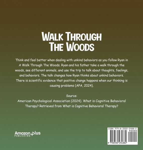 Think and feel better when dealing with unkind behaviors as you follow Ryan in A Walk Through The Woods. Ryan and his father take a walk through the woods, see different animals, and use the trip to talk about thoughts, feelings, and behaviors. The talk changes how Ryan thinks about unkind behaviors. There is scientific evidence that positive change happens when our thinking is causing problems (APA, 2024). Source: American Psychological Association (2024). What is Cognitive Behavioral Therapy? Retrieved from What is Cognitive Behavioral Therapy?