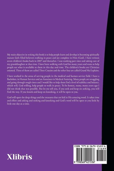 My main objective in writing this book is to help people learn and develop in becoming spiritually mature faith filled believers walking in peace and joy complete in Him (God). I have written seven children's books back in 2007 and thereafter. I was working part time and taking care of my granddaughter at that time. I have been walking with God for many years and want to help people see what is available to them in this day and time. The children's books are Christian oriented. Three of them are called Three Cousins and the other four are called Grand Ma Explains. I have worked in the areas of serving people in the medical and human service field. I have a Bachelors, in Human Services and an Associates in Medical Assisting. Many people are struggling and going through tough times and I would like to help them find a level of stability and balance, which will, God willing, help people to walk in peace. To be honest, many, many years ago I did not think that was possible. But let me tell you, if you seek and keep on seeking, you will find the way. If you knock and keep on knocking, it will be open to you. God will open the deep things and the treasures that are hid in His amazing word. It takes time and effort and asking and seeking and knocking and God's word will be open to you little by little one day at a time.