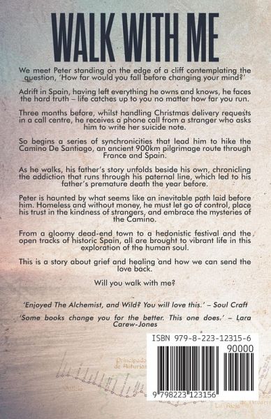 Powerful. Entertaining. Moving. A timely intervention into the conversation on mental health, masculinity, and suicide. - Soul Craft Your Life Podcast Reviews Set in a dead-end town in the Midlands and Northern Spain, this is an exploration of generational trauma and healing. It's entertaining yet honest, and that's the beauty of it. - James Pointer Pilgrims, Angels, Spirit Guides, and Spiritual Awakenings, what more do you need from a book about the Camino? - Dan K We meet Peter standing on the edge of a cliff contemplating the question, 'How far would you fall before changing your mind?' Adrift in Spain, having left everything he owns and knows, he faces the hard truth - life catches up to you no matter how far you run. Three months before, whilst sitting in a former police cell and handling Christmas delivery requests, he receives a phone call from a stranger who asks him to write her suicide note. So begins a series of synchronicities that lead him to hike the Camino De Santiago, an ancient pilgrimage route through France and Spain. As he walks, his father's story unfolds beside his own, chronicling the addiction that runs through his paternal line and which led to his father's premature death the year before. Peter is haunted by what seems like an inevitable path laid before him. Homeless and without money, he must let go of control, place his trust in the kindness of strangers, and embrace the mysteries of the Camino. Before he can finish his pilgrimage and reach the ocean, a reckoning awaits him in the desert. If he can face his family's past, he may yet walk into a new world. Inspired by true events, this story is about grief and healing and how we can send the love back. 900km to walk. A cycle of generational addiction to break. Embark on this inspirational journey of healing on the Camino De Santiago. From hedonistic festivals, psyche readings, spirit guides, and awakenings, to the rugged beauty and medieval streets of Northern Spain, homelessness becomes a pilgrimage, and an adventure in Spain unfolds. Sometimes you have to change everything to change yourself. An emotional rollercoaster that carries you the entire way - Laura Clements Some books change you for the better, this one does - M Harrigan A fascinating exploration of masculinity and the search for meaning in a post-Christian world - Stevie and Barbs Podcast I loved this book! Spirit guides, magical signs, listening to the heart, all grounded in a story that holds no punches - Fran, AU