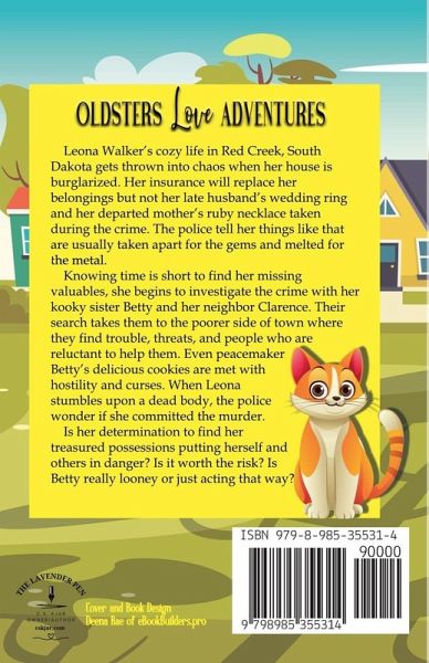 Oldster Leona Walker wants to find out who robbed her house in Red Creek, South Dakota and took her most precious possessions. She drags along her older sister Betty and her neighbor with a squeaky walker, Clarence, in her search. Their sleuthing gets them in trouble at every turn, and she may be charged with murder. Is her determination to find her dead husband's wedding band putting herself and others in danger? Is it worth the risk? Is her sister Betty really kooky or just acting that way? Find the answers in the lively and funny Book 1 of the Oldsters Love Adventure cozy mystery series.