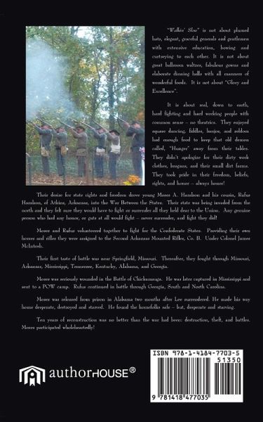 "Walkin' Slow" is not about plumed hats, elegant, graceful generals and gentlemen with extensive education, bowing and curtseying to each other. It is not about great ballroom waltzes, fabulous gowns and elaborate dinning halls with all manners of wonderful foods. It is not about "Glory and Excellence". It is about real, down to earth, hard fighting and hard working people with common sense - no theatrics. They enjoyed square dancing, fiddles, banjos, and seldom had enough food to keep that old demon called, "Hunger" away from their tables. They didn't apologize for their dirty work clothes, brogans, and their small dirt farms. They took pride in their freedom, beliefs, rights, and honor - always honor! Their desire for state rights and freedom drove young Moses A. Haralson and his cousin, Rufus Haralson, of Atkins, Arkansas, into the War Between the States. Their state was being invaded from the north and they felt sure they would have to fight or surrender all they held dear to the Union. Any genuine person who had any honor, or guts at all would fight - never surrender, and fight they did! Moses and Rufus volunteered together to fight for the Confederate States. Providing their own horses and rifles they were assigned to the Second Arkansas Mounted Rifles, Co. B. Under Colonel James McIntosh. Their first taste of battle was near Springfield, Missouri. Thereafter, they fought through Missouri, Arkansas, Mississippi, Tennessee, Kentucky, Alabama, and Georgia. Moses was seriously wounded in the Battle of Chickamauga. He was later captured in Mississippi and sent to a POW camp. Rufus continued in battle through Georgia, South and North Carolina. Moses was released from prison in Alabama two months after Lee surrendered. He made his was home desperate, destroyed and starved. He found the homefolks safe - but, desperate and starving. Ten years of reconstruction was no better than the war had been: destruction, theft, and battles. Moses participated wholeheartedly!