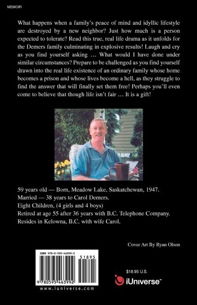 What happens when a family's peace of mind and idyllic lifestyle are destroyed by a new neighbor? Just how much is a person expected to tolerate? Read this true,real life drama as it unfolds for the Demers family culminating in explosive results! Laugh and cry as you find yourself asking ... What would I have done under similar circumstances? Prepare to be challanged as you find yourself drawn into the real life existence of an ordinary family whose home becomes a prison and whose lives become a hell, as they struggle to find the answer that will finally set them free! Perhaps you'll even come to believe that though life isn't fair... It is a gift!