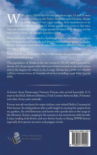 While Harry Miller and his two grandsons ages 12 and 16 were moose hunting on the Taylor Highway near Chicken, Alaska an EMP happens one night causing their motorhome to be inoperable. Since it was August 21 winter would soon come to this area. They are delayed due to his youngest grandson's injury while packing out the meat from a moose the youngest grandson killed. While hiking the 400 miles back to Anchorage they run into several problems with drug dealers, wild animals, and several other problems unique to Alaska. Winter and snow catch them 10 miles before reaching Palmer, Alaska and 60 miles from home. While they are gone Samantha, Harry's wife has her own problems to contend with back in Anchorage. The population of Alaska at the last census is 733,391 with a population density of 1.26 per square mile with most of them located on the road system and in the largest city which is Anchorage. Alaska has a little over 60,000 military veterans from all branches of service including many from Special OPS.
