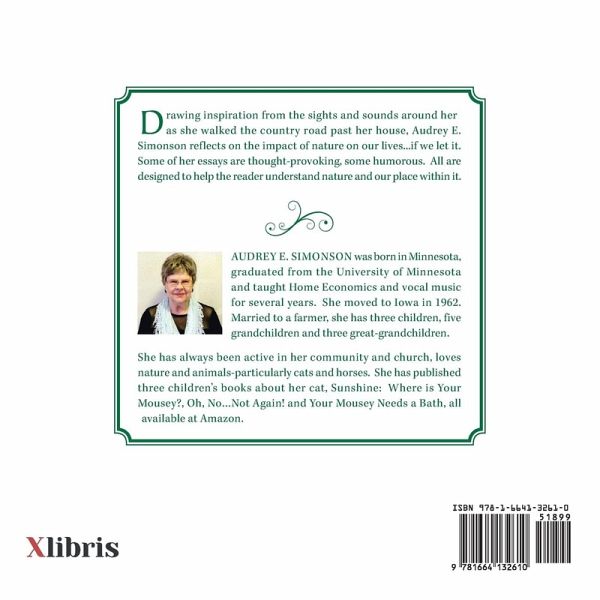 Drawing inspiration from the sights and sounds around her as she walked the country road past her house, Audrey E. Simonson reflects on the impact of nature on our lives...if we let it. Some of her essays are thought-provoking, some humorous. All are designed to help the reader understand nature and our place within it.