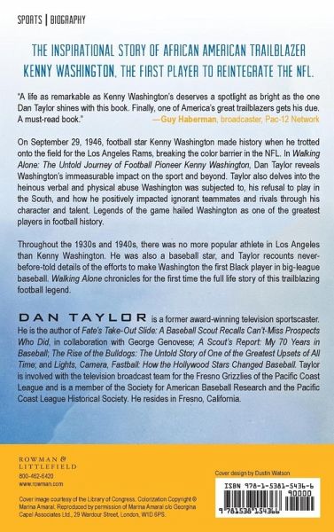 The inspirational story of African American trailblazer Kenny Washington, the first player to reintegrate the NFL. On September 29, 1946, football star Kenny Washington made history. When he trotted onto the field for the Los Angeles Rams, Washington broke the color barrier in the NFL. In Walking Alone: The Untold Journey of Football Pioneer Kenny Washington, Dan Taylor reveals Washington's immeasurable impact on his sport and beyond. Legends of the game hailed Washington as one of the greatest players in football history. He was also a baseball star, and Taylor recounts never-before-told details of the efforts to make Washington the first Black player in big league baseball along with Jackie Robinson. Taylor also delves into the heinous verbal and physical abuse Washington was subjected to, his refusal to play in the South, and how he positively impacted ignorant teammates and rivals through his character and talent. Throughout the 1930s and 1940s, there was no more popular athlete in Los Angeles than Kenny Washington. Walking Alone chronicles for the first time the life story of this trailblazing football legend.