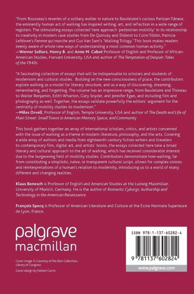 Klaus Benesch and François Specq, Modern(s) Walking: An Introduction.- Part I. Poetics.- Emmanuelle Peraldo, Walking the streets of London in the eighteenth century: a performative art?.- Juliette Fabre, Musing, Painting & Writing: Walking as an Art in Diderot's Promenade Vernet(Salon de 1767).- Estelle Murail, "Du croisement de leurs innombrables rapports": Baudelaire and De Quincey's flâneurs.- Thomas Pughe, How Poetry Comes to Him: An Excursion to Gary Snyder's Wild Poetics.- Lacy Rumsey, Revisiting the American "walk poem": A.R. Ammons, Charles Olson, and Jonathan Williams.- Part II. Performance.- Isabelle Baudino, Marianne Colston's Art of Walking: Gendering the Picturesque in Journal of a Tour in France, Switzerland, and Italy.- Bridget Sheridan, Following Footprints: photography, writing and the artist's book in art walking.- Gabrielle Finnane, Wayfaring in the Megacity: Tsai Ming Liang's Walker and Lav Diaz's Melancholia.- Tatiana Pogossian, The Art of Walking in Space and Time:the Quest for London.- Andrew Goodman, Walking with the world: towards an ecological approach to performative art practice.- Part III. Pathology.- Françoise Dupeyron-Lafay, The Art of Walking and the Mindscapes of Trauma in Thomas De Quincey's Autobiographical Works: The Pains of Wandering, the Pains of Remembering.- Sarah Mombert, Writing Dromomania in the Romantic Era: Nerval, Collins and Charlotte Brontë.- Catherine M. Welter, A Juggernaut in the Streets of London: Walking as Destructive Force in R.L. Stevenson's Strange Case of Dr. Jekyll and Mr. Hyde.- Amélie Moisy, Thomas Wolfe and the urban night prowl: walking, modernism and myth.- Sophie Walon, Existential wanderings in Gus Van Sant's "Walking Trilogy": Gerry, Elephant, and Last Days.- Part IV. Politics.- Julien Nègre, Perambulating the village: Henry David Thoreau and the politics of"Walking".- Virginia Ricard, Walking in Wartime: Edith Wharton's "The Look of Paris".- Andrew S. Gross, Pound, Peripatetic Verse, and the Postwar Liberal Aesthetic.- Marie Mianowski, The art of the 'good step' in Colm Tóibín's Bad Blood: A Walk Along the Irish Border (1987).- Andrew Estes, Walking and Technology in the Fiction of Jennifer Egan: Moving towards the Posthuman.