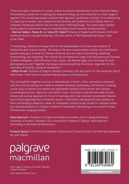 Klaus Benesch and François Specq, Modern(s) Walking: An Introduction.- Part I. Poetics.- Emmanuelle Peraldo, Walking the streets of London in the eighteenth century: a performative art?.- Juliette Fabre, Musing, Painting & Writing: Walking as an Art in Diderot's Promenade Vernet (Salon de 1767).- Estelle Murail, "Du croisement de leurs innombrables rapports": Baudelaire and De Quincey's flâneurs.- Thomas Pughe, How Poetry Comes to Him: An Excursion to Gary Snyder's Wild Poetics.- Lacy Rumsey, Revisiting the American "walk poem": A.R. Ammons, Charles Olson, and Jonathan Williams.- Part II. Performance.- Isabelle Baudino, Marianne Colston's Art of Walking: Gendering the Picturesque in Journal of a Tour in France, Switzerland, and Italy.- Bridget Sheridan, Following Footprints: photography, writing and the artist's book in art walking.- Gabrielle Finnane, Wayfaring in the Megacity: Tsai Ming Liang's Walker and Lav Diaz's Melancholia.- Tatiana Pogossian, The Art of Walking in Space and Time: the Quest for London.- Andrew Goodman, Walking with the world: towards an ecological approach to performative art practice.- Part III. Pathology.- Françoise Dupeyron-Lafay, The Art of Walking and the Mindscapes of Trauma in Thomas De Quincey's Autobiographical Works: The Pains of Wandering, the Pains of Remembering.- Sarah Mombert, Writing Dromomania in the Romantic Era: Nerval, Collins and Charlotte Brontë.- Catherine M. Welter, A Juggernaut in the Streets of London: Walking as Destructive Force in R.L. Stevenson's Strange Case of Dr. Jekyll and Mr. Hyde.- Amélie Moisy, Thomas Wolfe and the urban night prowl: walking, modernism and myth.- Sophie Walon, Existential wanderings in Gus Van Sant's "Walking Trilogy": Gerry, Elephant, and Last Days.- Part IV. Politics.- Julien Nègre, Perambulating the village: Henry David Thoreau and the politics of"Walking".- Virginia Ricard, Walking in Wartime: Edith Wharton's "The Look of Paris".- Andrew S. Gross, Pound, Peripatetic Verse, and the Postwar Liberal Aesthetic.- Marie Mianowski, The art of the 'good step' in Colm Tóibín's Bad Blood: A Walk Along the Irish Border (1987).- Andrew Estes, Walking and Technology in the Fiction of Jennifer Egan: Moving towards the Posthuman.