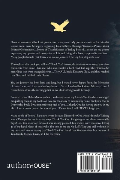 I have written several books of poems over many years....My poems are written for Friends/Loved ones, even Strangers, regarding Death/Birth/Marriage/Divorce....Poems about Politics/Government....Poems of Thankfulness/ of feeling Blessed.....some are my poems expressing my opinion and perception of Life and things that have happened in our lives...Many people/friends that I have met on my journey, from my first step until now Throughout this book you will see "Thank You" inserts, dedications to so many, also a few comments from some I had met who also traveled a hard road, but kept their Faith.....So many lives that were changed forever.....They ALL had a Dream/a Goal, and they reached that Goal and fulfilled their Dream Yes, the Journey has been hard and long, but I would never depart From the Memories of those I met and have touched my heart......So, as I walked back down Memory Lane, I remembered it was the turning point in my life, Nothing would I change I wanted to instill the Memory of each and every one of my friends/family who encouraged me, putting them in my book....There are too many to mention by name, but know that as I wrote this book, I was remembering each of you....I thank God for having put you in my life.....I am a better person because of you....Thank You, I will NEVER forget you Many books of Poetry I have now wrote Because I listened to God when He spoke Writing was a Therapy for me in many ways Thank You God for giving to me, these memorable days God, You know my future, it was already planned You walked with me, never letting go of my hand Many of those who You sent to me on My Life's Way Are still with me, in my heart and memory every day Thank You God for all that You have done It is because of You, family, friends, I made it, I did overcome