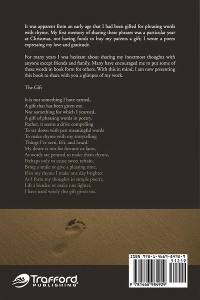It was apparent from an early age that I had been gifted for phrasing words with rhyme. My first memory of sharing these phrases was a particular year at Christmas, not having funds to buy my parents a gift; I wrote a poem expressing my love and gratitude. For many years I was hesitant about sharing my innermost thoughts with anyone except friends and family. Many have encouraged me to put some of these words in book form for others. With this in mind, I am now presenting this book to share with you a glimpse of my work. The Gift It is not something I have earned, A gift that has been given me. Nor something for which I yearned, A gift of phrasing words in poetry. Rather, it seems a drive compelling To set down with pen meaningful words To make rhyme with my storytelling Things I've seen, felt, and heard. My desire is not for fortune or fame, As words are penned to make them rhyme, Perhaps only to cause sweet refrain, Bring a smile or give a pleasing time. If in my rhyme I make one day brighter As I form my thoughts in simple poetry, Lift a burden or make one lighter, I have used wisely this gift given me.