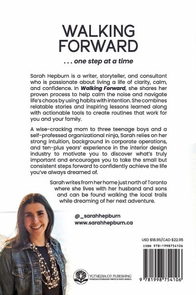 walking forward ... one step at at time Sarah Hepburn is a writer, storyteller, and consultant who is passionate about living a life of clarity, calm, and confidence. In Walking Forward, she shares her proven process to help calm the noise and navigate life's chaos by using habits with intention. She combines relatable stories and inspiring lessons learned along with actionable tools to create routines that work for you and your family. A wise-cracking mom to three teenage boys and a self-professed organizational ninja, Sarah relies on her strong intuition, background in corporate operations, and ten-plus years' experience in the interior design industry to motivate you to discover what's truly important and encourages you to take the small but consistent steps forward to confidently achieve the life you've always dreamed of. Sarah writes from her home just north of Toronto where she lives with her husband and sons and can be found walking the local trails while dreaming of her next adventure. Using the power of habit to navigate the chaos of life ... one step at at time