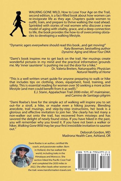 WALKING GONE WILD, How to lose your age on the trail, second edition, is a fact-filled book about how women can re-invigorate life as they age. Chapters guide women to outfit, train, and prepare to thrive walking the road ahead. Sprinkled with stories of real women who discover a new model of aging with vitality, grace, and a deep connection to life, the book provides the how-to of overcoming obstacles to developing a walking lifestyle.