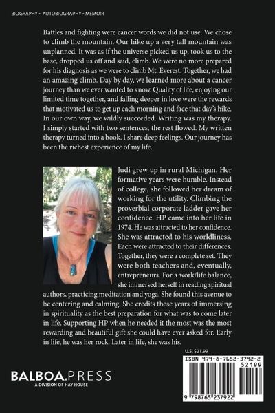Battles and fighting were cancer words we did not use. We chose to climb the mountain. Our hike up a very tall mountain was unplanned. It was as if the universe picked us up, took us to the base, dropped us off and said, climb. We were no more prepared for his diagnosis as we were to climb Mt. Everest. Together, we had an amazing climb. Day by day, we learned more about a cancer journey than we ever wanted to know. Quality of life, enjoying our limited time together, and falling deeper in love were the rewards that motivated us to get up each morning and face that day's hike. In our own way, we wildly succeeded. Writing was my therapy. I simply started with two sentences, the rest flowed. My written therapy turned into a book. I share deep feelings. Our journey has been the richest experience of my life.