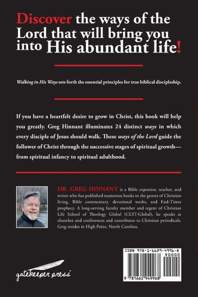 In Walking in His Ways, Greg Hinnant uses a plethora of biblical examples to set forth the essential principles for genuine Christian discipleship in clear, easy-to-understand language. He illuminates 24 distinct "ways"-spiritual life-disciplines-that every Christian "disciple," or deeply serious, irrevocably committed, self-disciplined, student-follower of Jesus, should know and live in daily. These Christlike ways guide you through the successive stages of Christian growth from spiritual infancy to maturity. Whatever your current experience, this book will speak to you, informing or reminding, encouraging or correcting, to inspire you to continue walking in his ways until you finish the course Jesus has set before you.