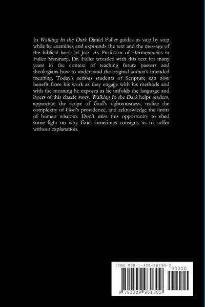 In "Walking In the Dark" Daniel Fuller guides us step by step while he examines and expounds the text and the message of the biblical book of Job. As Professor of Hermeneutics at Fuller Seminary, Dr. Fuller wrestled with this text for many years in the context of teaching future pastors and theologians how to understand the original author's intended meaning. Today's serious students of Scripture can now benefit from his work as they engage with his methods and with the meaning he exposes as he unfolds the language and layers of this classic story. "Walking In the Dark" helps readers, appreciate the scope of God's righteousness, realize the complexity of God's providence, and acknowledge the limits of human wisdom. Don't miss this opportunity to shed some light on why God sometimes consigns us to suffer without explanation.