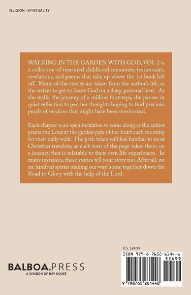 WALKING IN THE GARDEN WITH GOD, VOL 2 is a collection of treasured childhood memories, testimonies, revelations, and poems that take up where the 1st book left off. Many of the stories are taken from the author's life, as she strives to get to know God on a deep, personal level. As she walks the journey of a million footsteps, she pauses in quiet reflection to pen her thoughts hoping to find precious pearls of wisdom that might have been overlooked. Each chapter is an open invitation to come along as the author greets the Lord at the garden gate of her heart each morning for their daily walk.…mehr