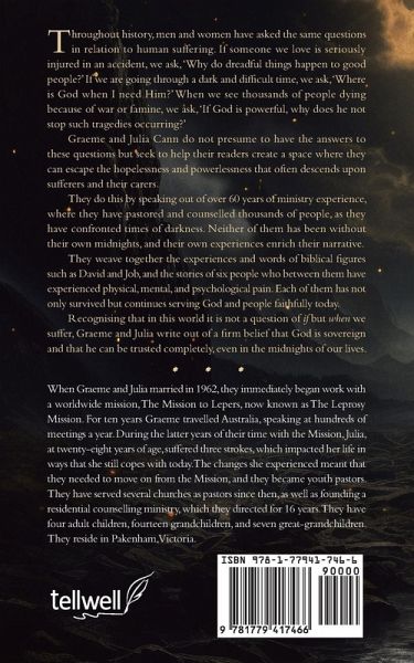 Throughout history, men and women have asked the same questions in relation to human suffering. If someone we love is seriously injured in an accident, we ask, 'Why do dreadful things happen to good people?' If we are going through a dark and difficult time, we ask, 'Where is God when I need Him?' When we see thousands of people dying because of war or famine, we ask, 'If God is powerful, why does he not stop such tragedies occurring?' Graeme and Julia Cann do not presume to have the answers to these questions but seek to help their readers create a space where they can escape the hopelessness and powerlessness that often descends upon sufferers and their carers. They do this by speaking out of over 60 years of ministry experience, where they have pastored and counselled thousands of people, as they have confronted times of darkness. Neither of them has been without their own midnights, and their own experiences enrich their narrative. They weave together the experiences and words of biblical figures such as David and Job and the stories of six people who, between them have experienced physical, mental, and psychological pain. Each of them has not only survived but continue serving God and people faithfully today. Recognising that in this world it is not a question of if but when we suffer, Graeme and Julia write out of a firm belief that God is sovereign and that he can be trusted completely, even in the midnights of our lives.