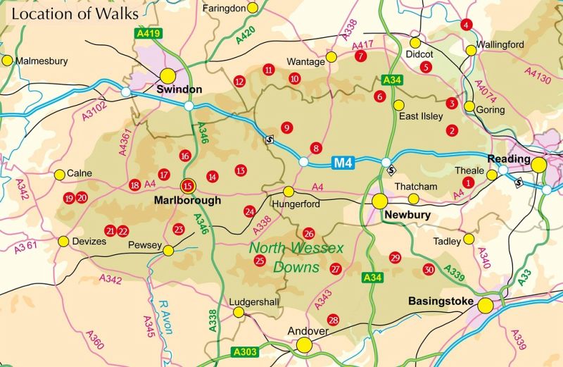 30 walking routes exploring the North Wessex Downs Area of Outstanding Natural Beauty (AONB). The routes are between 7 and 20km through this peaceful rolling chalk landscape and cover parts of four counties: Berkshire, Hampshire, Wiltshire and Oxfordshire, with walks to reach the highest point in each one.
