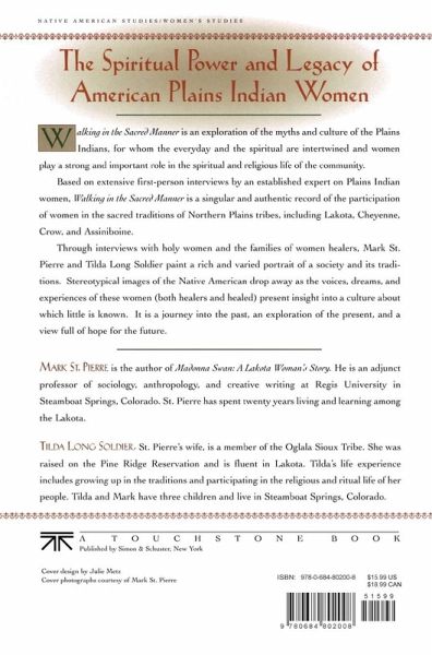 Walking in the Sacred Manner is an exploration of the myths and culture of the Plains Indians, for whom the everyday and the spiritual are intertwined and women play a strong and important role in the spiritual and religious life of the community. Based on extensive first-person interviews by an established expert on Plains Indian women, Walking in the Sacred Manner is a singular and authentic record of the participation of women in the sacred traditions of Northern Plains tribes, including Lakota, Cheyenne, Crow, and Assiniboine. Through interviews with holy women and the families of women healers, Mark St. Pierre and Tilda Long Soldier paint a rich and varied portrait of a society and its traditions. Stereotypical images of the Native American drop away as the voices, dreams, and experiences of these women (both healers and healed) present insight into a culture about which little is known. It is a journey into the past, an exploration of the present, and a view full of hope for the future.