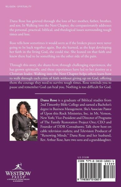Dana Rose has grieved through the loss of her mother, father, brother, and son. In Walking into the Next Chapter, she compassionately addresses the personal, practical, biblical, and theological issues surrounding tough times and loss. Rose tells how sometimes it would seem as if the broken pieces were never going to be back together again. But she learned, as she kept developing her faith in the living God, she could rise. She leaned on that faith and knew there had to be something on the other side of the pain. Through this story, she shares how, through challenging experiences, she has grown spiritually, and these experiences have led to her destiny as a Christian leader. Walking into the Next Chapter helps others learn how to walk through each crisis of faith without giving up on God, offering them the courage they need to survive tough times. Rose reminds you to pause and remember God can heal you. Nothing is too difficult for God.