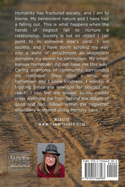 Humanity has fractured society, and I am to blame. My benevolent nature and I have had a falling out. This is what happens when the hands of neglect fail to nurture a relationship. Society is not an object I can point to in someone else's yard. I am society, and I have doom scrolled my way into a state of detachment as skepticism dampens my desire for connection. My small, Kansas hometown did not raise me this way. Caring examples of community surrounded my childhood. Once upon a time, my hometown and I knew kindness. I wonder if trusting times are now too far beyond my reach. I can feel the answer to my midlife crisis watching me from behind the details of good and bad, hidden within the neglected shrubbery scattered along Memory Lane.