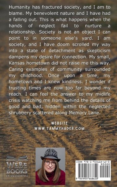 Humanity has fractured society, and I am to blame. My benevolent nature and I have had a falling out. This is what happens when the hands of neglect fail to nurture a relationship. Society is not an object I can point to in someone else's yard. I am society, and I have doom scrolled my way into a state of detachment as skepticism dampens my desire for connection. My small, Kansas hometown did not raise me this way. Caring examples of community surrounded my childhood. Once upon a time, my hometown and I knew kindness. I wonder if trusting times are now too far beyond my reach. I can feel the answer to my midlife crisis watching me from behind the details of good and bad, hidden within the neglected shrubbery scattered along Memory Lane.