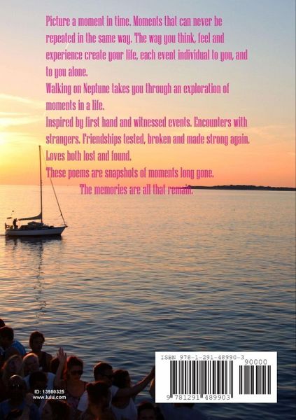 Picture a moment in time. Moments that can never be repeated in the same way. The way you think, feel and experience create your life, each event individual to you, and to you alone. Walking on Neptune takes you through an exploration of moments in a life. Inspired by first hand and witnessed events. Encounters with strangers. Friendships tested, broken and made strong again. Loves both lost and found. These poems are snapshots of moments long gone. The memories are all that remain.