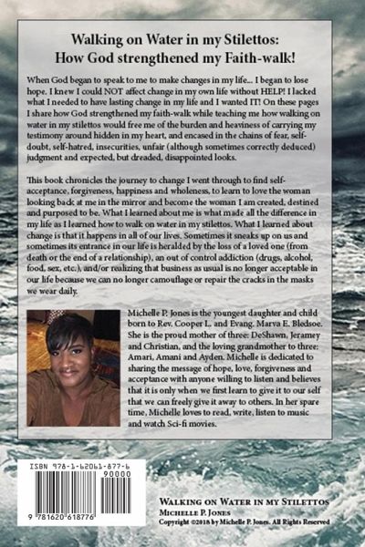 WALKING ON WATER IN MY STILETTOS: HOW GOD CHANGED MY FAITH-WALKHave you ever been in a situation where CHANGE jumped up and slapped you in the face? Well, that very thing happened to me when God took me through a very public and personal season of change. A season of change that forced me to sit up, take notice, and realize that my life was literally SPIRALING OUT OF CONTROL!!! This season of CHANGE turned out to be a life SAVING and life CHANGING experience for me and taught me that it'll look different from person to person. While writing this book, God took me on a journey of SELF-DISCOVERY that showed me how every experience, every trial, every tribulation, every heartache, and every heartbreak was necessary for me to be who I am and where I am today! This journey brought me to the door of ACCEPTANCE and GROWTH that required me to answer one (1) simple question, 'In what way is CHANGE demanding entrance into my life,' to grant me entrance. I challenge you to read this book and begin to answer the question for yourself: "In what way is change knocking on my door demanding entrance?" If you are looking for personal self-acceptance, forgiveness, happiness, and wholeness, learn to love the woman looking back at you in the mirror and become the woman you're created, destined, and purposed to be, then this book IS for you. It will provide you with a road map to discover what I learned, in your own life. My story shows you that when CHANGE slaps you in the face you can no longer camouflage the cracks in the masks you wear daily, just like I couldn't. Michelle P. Jones is the youngest daughter and child born to Rev. Cooper L. and Evang. Marva E. Bledsoe. She is the proud mother of three: DeShawn, Jeramey, and Christian, and the loving grandmother to three: Amari, Amani, and Ayden. Michelle is dedicated to sharing the message of hope, love, forgiveness, and acceptance with anyone willing to listen and believes that it is only when we first learn to give it to ourselves that we can freely give it away to others. In her spare time, Michelle loves to read, write, listen to music, and watch Sci-fi movies.