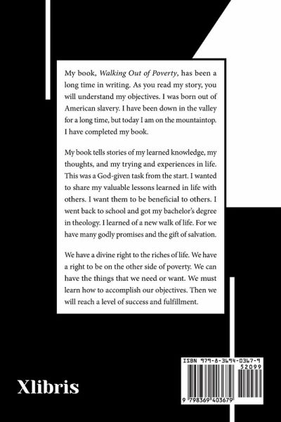 My book, Walking Out of Poverty, has been a long time in writing. As you read my story, you will understand my objectives. I was born out of American slavery. I have been down in the valley for a long time, but today I am on the mountaintop. I have completed my book. My book tells stories of my learned knowledge, my thoughts, and my trying and experiences in life. This was a God-given task from the start. I wanted to share my valuable lessons learned in life with others. I want them to be beneficial to others. I went back to school and got my bachelor's degree in theology. I learned of a new walk of life. For we have many godly promises and the gift of salvation. We have a divine right to the riches of life. We have a right to be on the other side of poverty. We can have the things that we need or want. We must learn how to accomplish our objectives. Then we will reach a level of success and fulfillment.