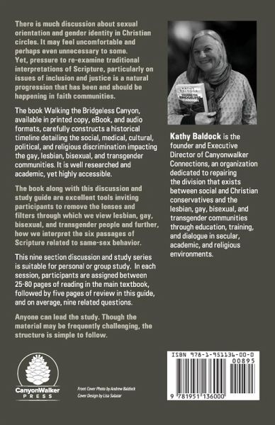 This discussion guide was created as a companion to the 458-page "Walking the Bridgeless Canyon: Repairing the Breach between the Church and the LGBT Community." In that book, Baldock uncovers the historical, cultural, medical, and political filters of discrimination through which the LGBT community is seen.