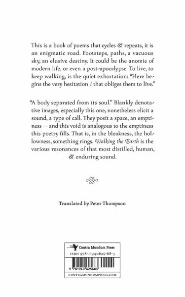 This is a book of poems that cycles and repeats, it is an enigmatic road. Footsteps, paths, a vacuous sky, an elusive destiny. It could be the anomie of modern life, or even a post-apocalypse. To live, to keep walking, is the quiet exhortation: "Here begins the very hesitation / that obliges them to live." "A body separated from its soul." Blankly denotative images, especially this one, nonetheless elicit a sound, a type of call. They posit a space, an emptiness - and this void is analogous to the emptiness this poetry fills. That is, in the bleakness, the hollowness, something rings. Walking the Earth is the various resonances of that most distilled, human, and enduring sound.