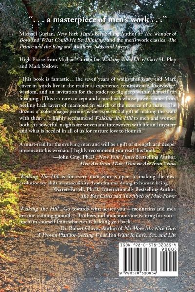 Feeling alone with no sense of purpose? Not sure where you belong? This is our story of finding direction in a commitment to a healing ritual, a strenuous trail climb. What was intended to be a simple sharing exercise and a time to bond between two men became a form of meditation, deep revelation and healing. The path became filled with the life reflections of two men who speak their personal truth. What inspired us will empower you with the courage to speak your own truth without shame and claim your place and purpose in life. Many of us carry trauma, Veteran or civilian. Walking the Hill: The Art of Accidental Transformation is an example of how nature can nurture healing. Join with us on our walk of self-reflection and connection. Walking the Hill is a no nonsense path in how to man up and discover who you are as a man and answer the ancient question of all seekers of wisdom, "Who am I". Are you tired of doing life alone and are you are hungry for an adventure that will organically change you? If so, this is your book. This is an invitation and challenge to join us for a walk of a lifetime. As transformation occurs over time you will have an inner knowing of who you are and welcome yourself home as I have. You will no longer be alone as it is not just about you. We suffer to be free, and freedom converts suffering to meaning. What is your life purpose? Are you willing to be vulnerable? Do you know where you belong? This is an invitation to join us on an organic personal, spiritual and transformative journey. Walking the Hill: The Art of Accidental Transformation is a guided meditative unfolding of man's true nature unto himself. It will challenge and inspire you. ### Michael Gurian, New York Times Best Selling Author of The Wonder of Boys and What Could He Be Thinking? and the men's work classics, The Prince and the King and Mothers, Sons and Lovers. High Praise from Michael Gurian for Walking The Hill by Gary H. Plep and Mark Yoslow: "This book is fantastic...The seven years of walks that Gary and Mark cover in words live in the reader as experience, reminiscence, knowledge, wisdom, and an invitation for the reader to dig deep within himself for meaning...This is a rare concept and a rare book whose power comes from peeling back layers of manhood in search of the essence of a man...The dozens of color images permit us the experiential gift of making the walk with them ...I highly recommend Walking The Hill to men and women both. Its powerful insights are woven and interwoven with life and mystery and what is needed in all of us for mature love to flourish." A must-read for the evolving man and will be a gift of strength and deeper presence to his woman. I highly recommend you read this book. -John Gray, Ph.D., New York Times Bestselling Author, Men Are from Mars, Women Are from Venus Walking The Hill is for every man who is open to making the next evolutionary shift in masculinity: from human doing to human being. -Warren Farrell, Ph.D., Internationally Bestselling Author, The Boy Crisis and The Myth of Male Power Walking The Hill...Go towards what scares you - mountains and men are our training ground... Brothers and mountains are waiting for you - unchain yourself from whatever is holding you back. -Dr. Robert Glover, Author of No More Mr. Nice Guy: A Proven Plan for Getting What You Want in Love, Sex, and Life