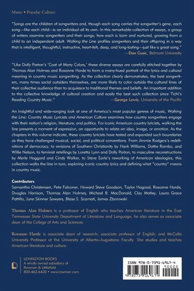 Walking the Line: Country Music Lyricists and American Culture examines how country songwriters engage with their nation’s religion, literature, and politics. Walking the line requires following strict codes, respecting territories, and, sometimes, yearning to break those bonds. This collection’s essays explore how iconic country lyricists such as Johnny Cash, Dolly Parton, and Steve Earle have tested and expanded such boundaries, challenging musical, social, and political conventions, often reevaluating what "country" means in country music.