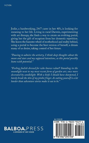 Jodie, a hardworking, 24/7 carer in her 40's, is looking for meaning to her life. Living in rural Darwin, experimenting with art therapy, she finds a way to create an evolving portal, giving her the gift of escapism from her domestic repetition. She leaves the hamster wheel of motherhood and reality behind, using a portal to become the best version of herself, a dream many of us desire, taking control of her future. "Pausing to admire the artistry, I think deep thoughts about the moon and stars and my supposed intentions, as this portal possibly hums with potential." "Feeling foolish dressed for who knows what? Standing in the moonlight next to my most recent form of garden art, once more decorated by candlelight. With a knife I should have sharpened, I barely break the skin of my pinkie finger. As cutting yourself is a lot harder than adventure stories make it out to be."