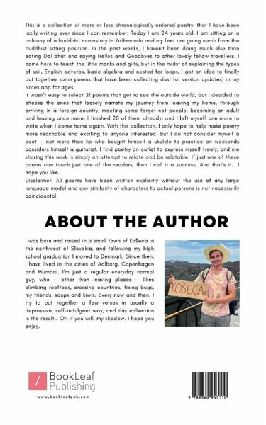 ""This is a collection of more or less chronologically ordered poetry, that I have been lazily writing ever since I can remember. Today I am 24 years old, I am sitting on a balcony of a buddhist monastery in Kathmandu and my feet are going numb from the buddhist sitting position. In the past weeks, I haven't been doing much else than eating Dal bhat and saying Hellos and Goodbyes to other lovely fellow travellers. I came here to teach the little monks and girls, but in the midst of explaining the types of soil, English adverbs, basic algebra and nested for loops, I got an idea to finally put together some poems that have been collecting dust (or version updates) in my Notes app for ages. It wasn't easy to select 21 poems that get to see the outside world, but I decided to choose the ones that loosely narrate my journey from leaving my home, through arriving in a foreign country, meeting some forget-not people, becoming an adult and leaving once more. I finished 20 of them already, and I left myself one more to write when I come home again. With this collection, I only hope to help make poetry more reachable and exciting to anyone interested. But I do not consider myself a poet - not more than he who bought himself a ukulele to practice on weekends considers himself a guitarist. I find poetry an outlet to express myself freely, and me sharing this work is simply an attempt to relate and be relatable. If just one of these poems can touch just one of the readers, then I call it a success. And that's it... I hope you like. Disclaimer: All poems have been written explicitly without the use of any large language model and any similarity of characters to actual persons is not necessarily coincidental.""