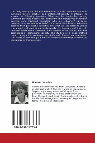 This study investigates the inter-relationship of early childhood educators' curriculum beliefs, practices and professional identity. It attempts to answer the following questions: What are the relationships among curriculum practices, beliefs about curriculum, and professional identities in qualified early childhood educators, what are educators' curriculum practices, what are educators' beliefs about curriculum, how do educators describe their professional identities and what are the relations among educational and professional backgrounds of educators and their self-reported beliefs about curriculum, their practices of curriculum, and their descriptions of professional identity. This study uses a mixed method research design that combines case study and observational assessment. This results in uncovering a number of complex relationships between the educators and their practices.