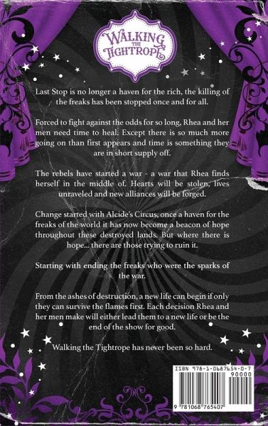 Last Stop is no longer a haven for the rich, the killing of the freaks has been stopped once and for all. Forced to fight against the odds for so long, Rhea and her men need time to heal. Except there is so much more going on than first appears and time is something they are in short supply off. The rebels have started a war - a war that Rhea finds herself in the middle of. Hearts will be stolen, lives unraveled and new alliances will be forged. Change started with Alcide's Circus, once a haven for the freaks of the world it has now become a beacon of hope throughout these destroyed lands. But where there is hope... there are those trying to ruin it. Starting with ending the freaks who were the sparks of the war. From the ashes of destruction, a new life can begin if only they can survive the flames first. Each decision Rhea and her men make will either lead them to a new life or be the end of the show for good. Walking the Tightrope has never been so hard.