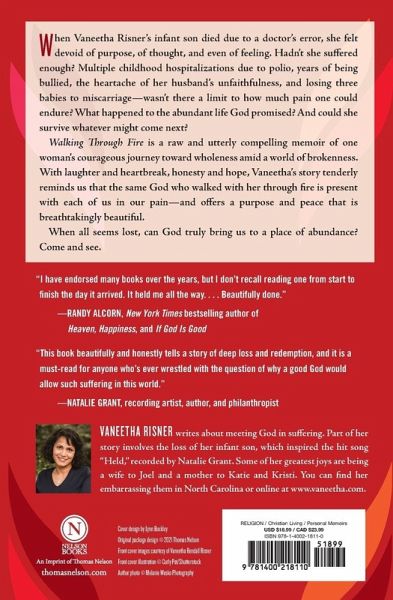 Vaneetha Risner is a writer and speaker who is passionate about helping people find hope in the midst of suffering. Part of her story is losing her infant son, which was the inspiration for the hit song "Held," recorded by Natalie Grant. She is also the author of The Scars That Have Shaped Me: How God Meets Us in Suffering. Before she started writing, Vaneetha had a career in business and received her BS from University of Virginia's McIntire School of Commerce and her MBA from Stanford Graduate School of Business. Vaneetha is married to Joel and has two grown daughters, Katie and Kristi.