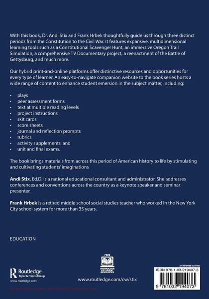 With this book, Dr. Andi Stix and Frank Hrbek thoughtfully guide us through three distinct periods from the Constitution to the Civil War. It features expansive, multidimensional learning tools such as a Constitutional Scavenger Hunt, an immersive Oregon Trail Simulation, a comprehensive TV Documentary project, a reenactment of the Battle of Gettysburg, and much more.