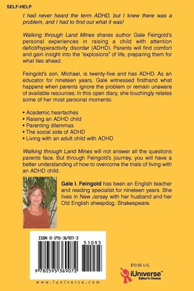 I had never heard the term ADHD, but I knew there was a problem, and I had to find out what it was! Walking through Land Mines shares author Gale Feingold's personal experiences in raising a child with attention deficit/hyperactivity disorder (ADHD). Parents will find comfort and gain insight into the 'explosions" of life, preparing them for what lies ahead. Feingold's son, Michael, is twenty-five and has ADHD. As an educator for nineteen years, Gale witnessed firsthand what happens when parents ignore the problem or remain unaware of available resources. In this open diary, she touchingly relates some of her most personal moments: Academic heartaches Raising an ADHD child Parenting dilemmas The social side of ADHD Living with an adult child with ADHD Walking through Land Mines will not answer all the questions parents face. But through Feingold's journey, you will have a better understanding of how to overcome the trials of living with an ADHD child.