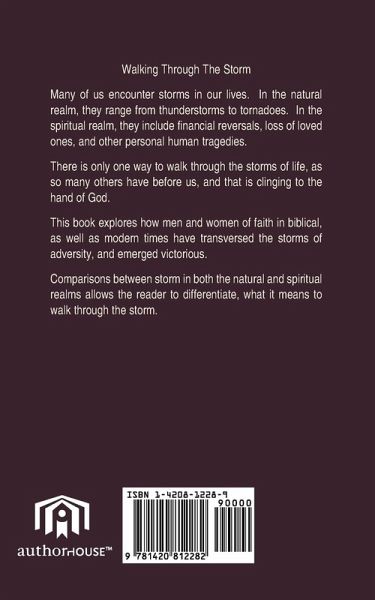 Many of us encounter storms in our lives. In the natural realm, they range from thunderstorms to tornadoes. In the spiritual realm, they include financial reversals, loss of loved ones, and other personal human tragedies. There is only one way to walk through the storms of life, as so many others have before us, and that is clinging to the hand of God. This book explores how men and women of faith in biblical, as well as modern times have transversed the storms of adversity, and emerged victorious. Comparisons between storm in both the natural and spiritual realms allows the reader to differentiate, what it means to walk through the storm.