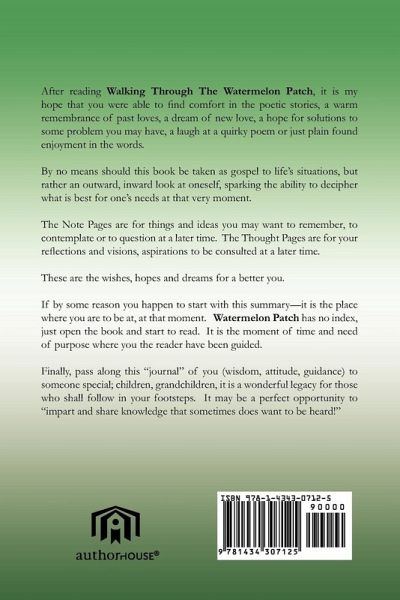After reading "Walking Through The Watermelon Patch", it is my hope that you were able to find comfort in the poetic stories, a warm remembrance of past loves, a dream of new love, a hope for solutions to some problem you may have, a laugh at a quirky poem or just plain found enjoyment in the words. By no means should this book be taken as gospel to life's situations, but rather an outward, inward look at oneself, sparking the ability to decipher what is best for one's needs at that very moment. The Note Pages are for things and ideas you may want to remember, to contemplate or to question at a later time. The Thought Pages are for your reflections and visions, aspirations to be consulted at a later time. These are the wishes, hopes and dreams for a better you. If by some reason you happen to start with this summary-it is the place where you are to be at that moment. "Watermelon Patch" has no index, just open the book and start to read. It is the moment of time and need of purpose where you the reader have been guided. Finally, pass along this "journal" of You (wisdom, attitude, guidance) to someone special; children, grandchildren, it is a wonderful legacy for those who shall follow in your footsteps. It may be a perfect opportunity to "impart and share knowledge that sometimes does not want to be heard!"