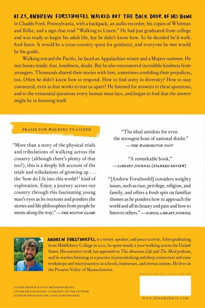 A memoir of one young man's coming-of-age on a cross-country trek--told through the stories of the people of all ages, races, and inclinations he meets along the highways of America. At twenty-three, Andrew Forsthoefel walked out the back door of his home in Chadds Ford, Pennsylvania, with a backpack, an audio recorder, his copies of Whitman and Rilke, and a sign that read walking to listen. He had just graduated from Middlebury College and was ready to begin his adult life, but he didn't know how. So he decided he'd walk. And listen. It would be a cross-country quest for guidance, and everyone he met would be his guide. Walking toward the Pacific, he faced an Appalachian winter and a Mojave summer. He met beasts inside: fear, loneliness, doubt. But he also encountered incredible kindness from strangers. Thousands shared their stories with him, sometimes confiding their prejudices, too. Often he didn't know how to respond. How to find unity in diversity? How to stay connected, even as fear works to tear us apart? He listened for answers to these questions, and to the existential questions every human must face, and began to find that the answer might be in listening itself. Ultimately, it's the stories of others living all along the roads of America that carry this journey and sing out in a hopeful, heartfelt book about how a life is made, and how our nation defines itself at the most human level.
